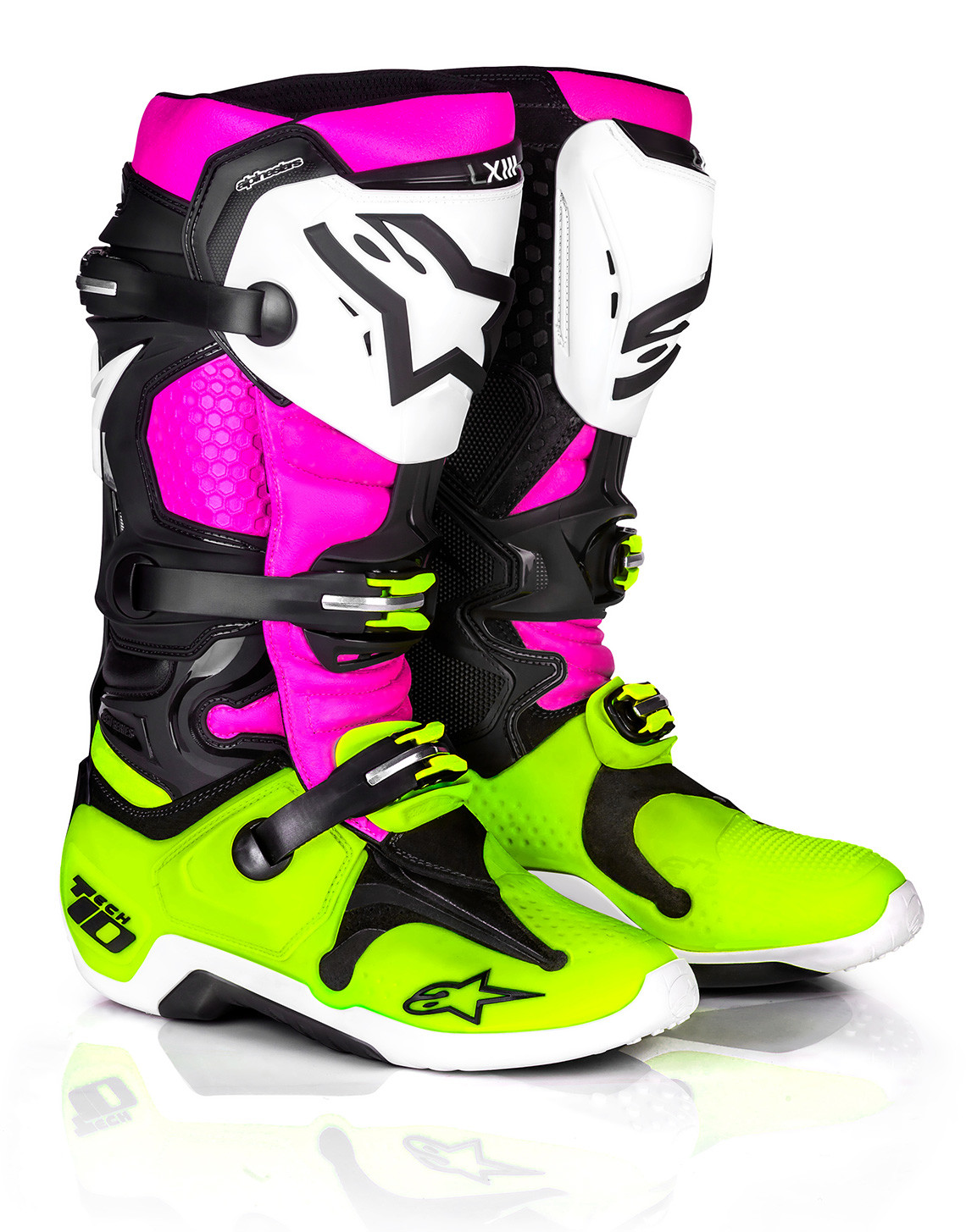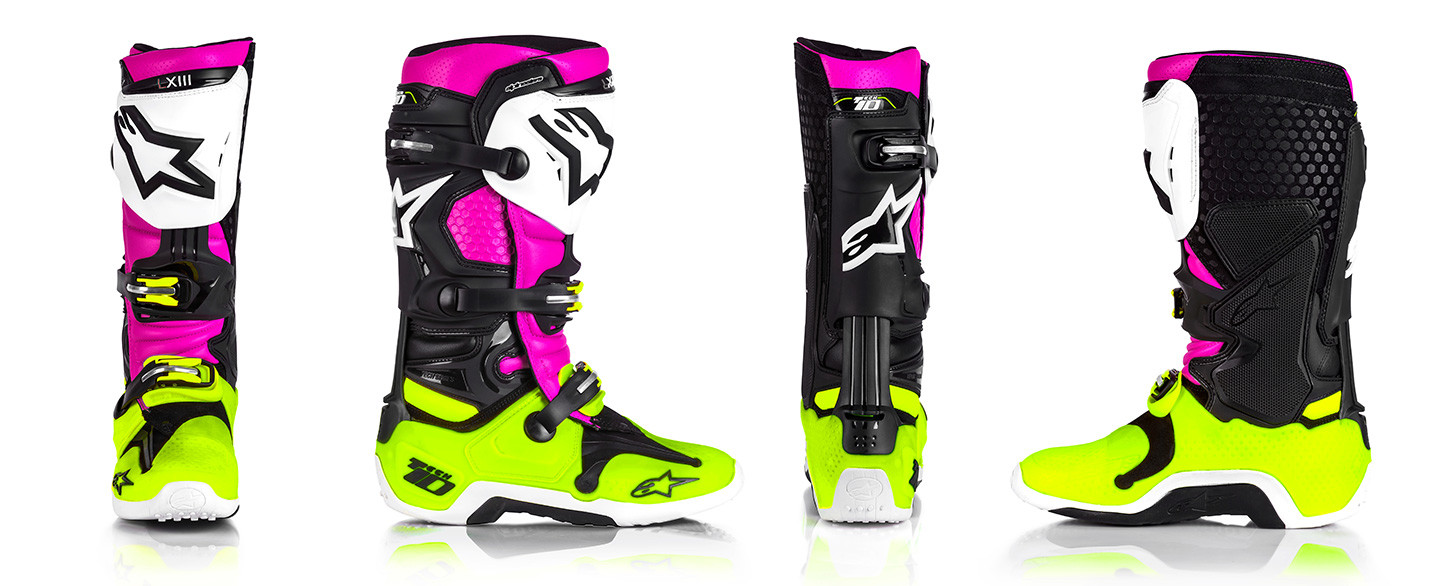 The world’s most technologically advanced and protective motocross boot, the Tech 10 offers unrivalled race-winning performance to dirt riders who demand nothing less than the best. The Limited Edition ‘Radiant’ Tech 10 fuses all the performance innovations of the iconic Tech 10 with an exclusive color combination. Bright and vivid, the ‘Radiant’ Tech 10 features a fluo yellow lower chassis, a luminous pink front upper, and a bright white shin plate. To complete the look, the rear of the boot is sleek black with an Alpinestars logo accented in white. The result is a vibrant, high performance motocross boot worthy to be debuted at one of the most exciting Supercross rounds of the year.